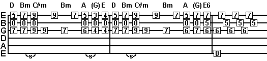 Refrain: D - Bm - C#m - Bm - A - (G) - E, twice. Add this for tastiness (again, not recorded so far):